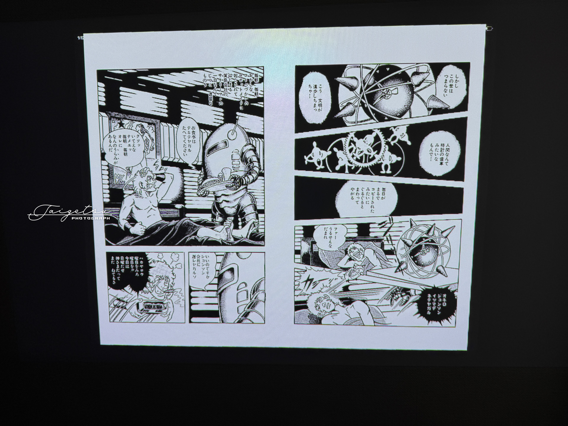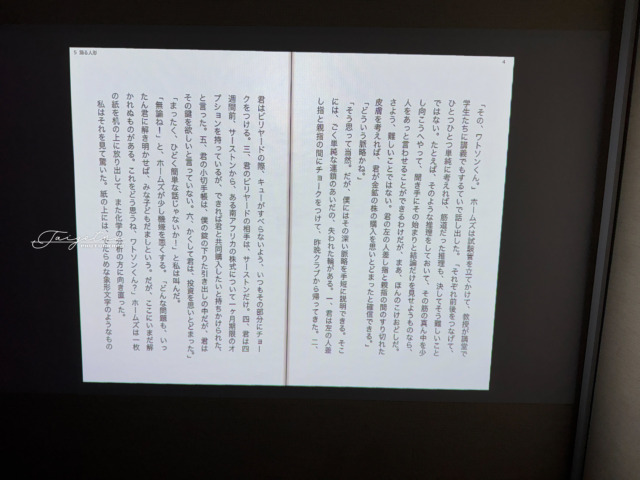 真正面に投影しているわけではないので、台形補正している関係で奥の方の文字が若干潰れていますが、電子書籍なら文字を大きくできるので無問題。